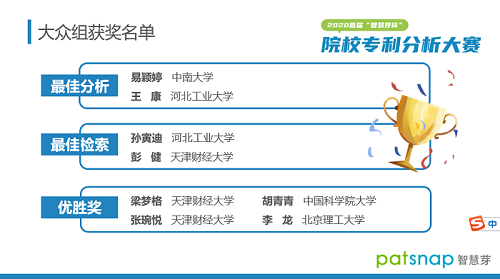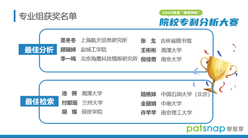 5月8日, 由中国知识产权培训中心、国家科技信息资源综合利用与公共服务中心等机构指导,智慧芽信息科技(苏州)有限公司主办的2020首届“智慧芽杯”院校专利分析大赛圆满落幕。365英国官网登录入口师生在此次比赛中斩获了“最佳分析奖”、“最佳检索奖”和“优胜奖”三个奖项,充分展示了我校师生在专利检索分析上的出色水平和能力。