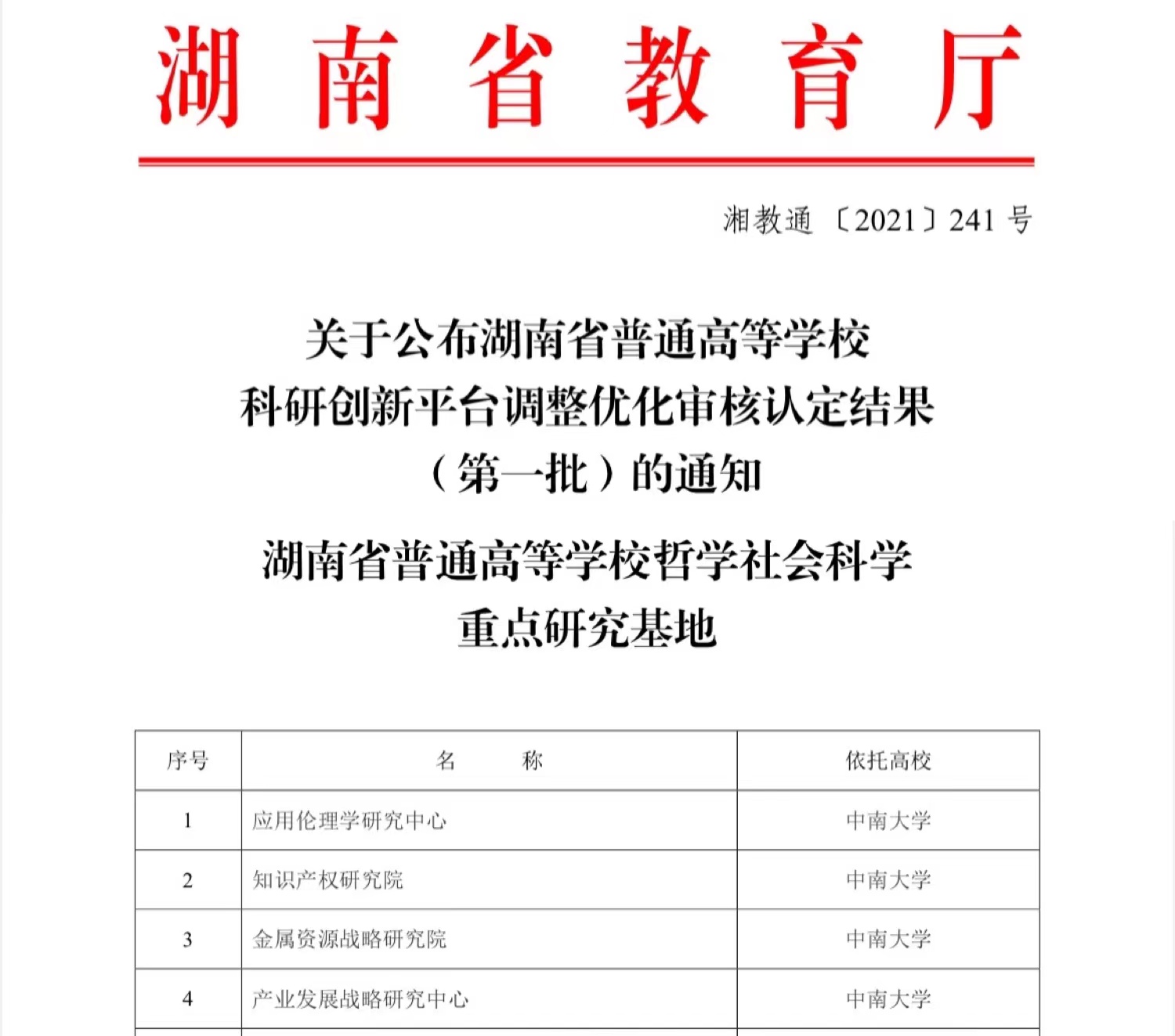 2021年,湖南省教育厅发布《关于公布湖南省普通高等学校科研创新平台调整优化审核认定结果(第一批)的通知》(湘教通〔2021〕241号),365英国官网登录入口知识产权研究院(以下简称“知识产权研究院”)成功入选调整优化后的第一批湖南省普通高等学校科研创新平台。