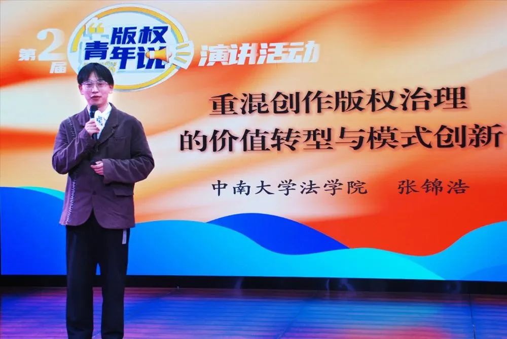 本次活动共邀请了十位来自全国各界的青年才俊,英国正版365官方网站硕士研究生张锦浩作为本次活动受邀的唯一京外高校学生,以《重混创作版权治理的价值转型与模式创新》为题发表演讲。他以真挚饱满的感情从“重混技术发展引发传统版权治理挑战”、“促进重混创作版权治理价值转型”、“构建重混创作版权治理开放创新模式”三个方面分享了独到见解,展现了新时代版权青年的熠熠风采,表达了对国家版权事业发展的热切关注与衷心祝愿。