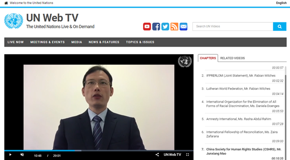 当天下午,在议程项目九:“种族主义、种族歧视、仇外心理和相关不容忍行为:《德班宣言和行动纲领》”之下,毛俊响教授代表中国人权研究会在与当代形式种族主义、种族歧视、仇外心理和有关不容忍行为问题特别报告员的互动对话环节中做了专题视频发言,在新冠疫情爆发的背景之下,向国际社会传达了来自中国学者对于种族歧视问题的观点与立场。