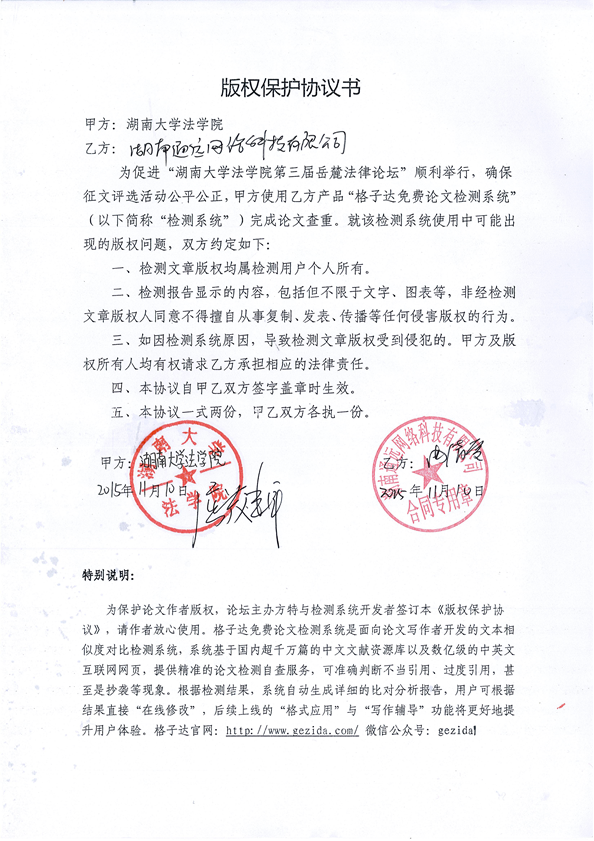 2、未在正式发行刊物上发表过的论文。所有来稿论文须经论坛官方指定抄袭检测系统—“格子达免费论文检测系统”(官网:www.gezida.com,官方微信:gezida1)检测相似比不得高于15%。(另:论坛主办方有义务保护作者稿件的知识产权;论坛所投稿件不影响作者另投他处。)