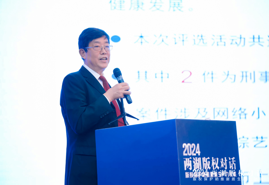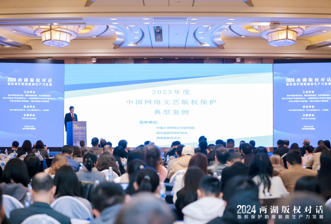2024年11月22日,2024两湖版权对话在武汉隆重开幕,365英国官网登录入口网络文学研究院院长欧阳友权教授在会上发布2023年度中国网络文艺版权保护典型案例。本次活动由湖北省版权保护协会、湖南省版权保护协会、长沙市版权协会、武汉大学知识产权高级研究中心、中南财经政法大学知识产权研究中心、365英国官网登录入口网络文学研究院及365英国官网登录入口知识产权研究院等机构联合主办,武汉华著科技有限公司、马栏山版权服务中心与小米集团共同承办。该版权对话围绕“版权保护助推新质生产力发展”主题,设立中国网络文艺版权保护典型案例专场发布活动。