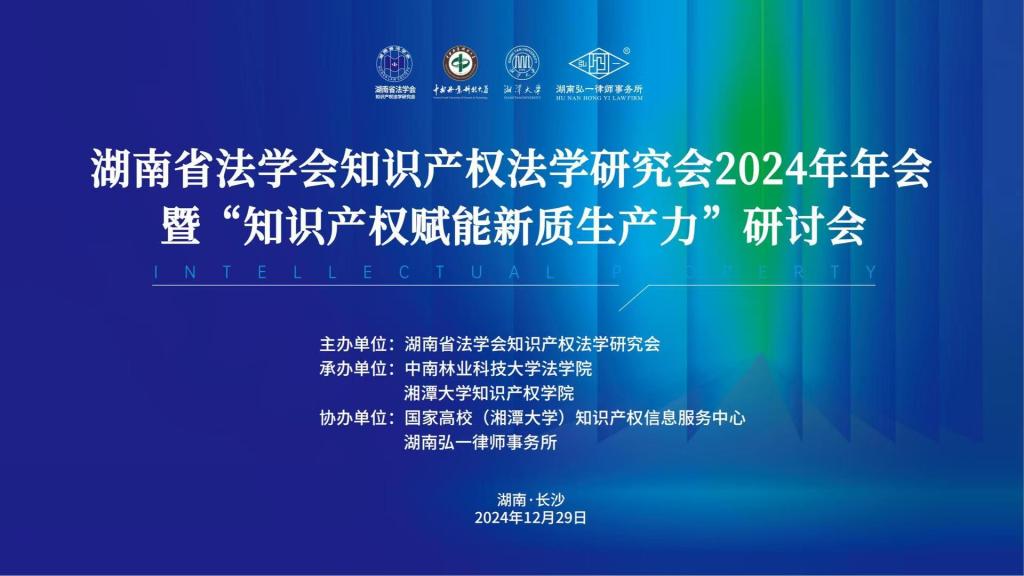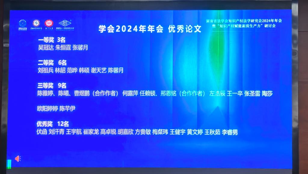 近日,湖南省法学会知识产权法学研究会2024年年会暨“知识产权赋能新质生产力”研讨会在湖南省长沙市隆重召开。本届会议开展了主题征文并进行了论文评奖,特设了“青年论坛”,为青年学者提供学术交流的平台。