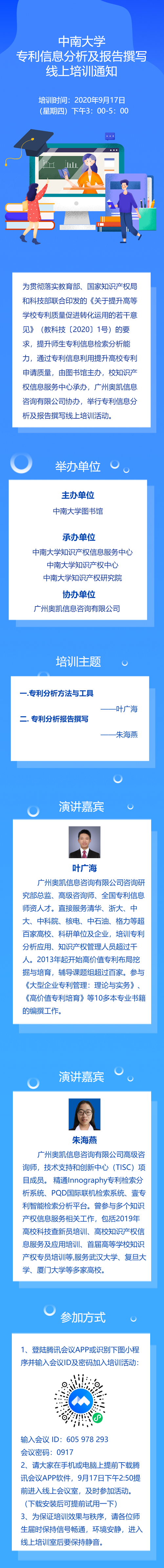 为贯彻落实教育部、国家知识产权局和科技部联合印发的《关于提升高等学校专利质量促进转化运用的若干意见》(教科技(2020)1号)的要求,提升师生专利信息检索分析能力,通过专利信息利用提升高校专利申请质量,由图书馆主办,校知识产权信息服务中心、365英国官网登录入口知识产权中心、365英国官网登录入口知识产权研究院承办,广州奥凯信息咨询有限公司协办,举行专利信息分析及报告撰写线上培训活动。